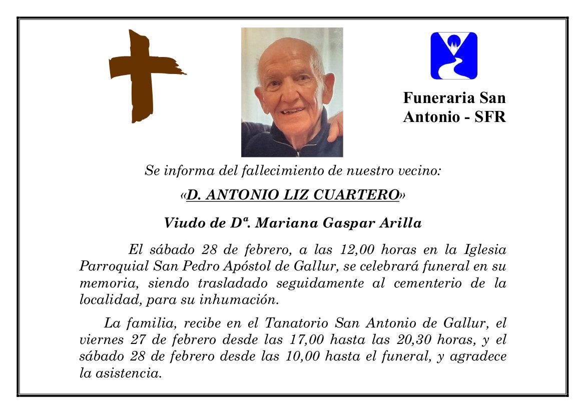 D. ANTONIO LIZ CUARTERO por josemaria.sau@funerariasdetudela.es | Feb 27, 2026 | Esquelas, Tanatorio San Antonio (Gallur) 27/02/2026 Tanatorio San Antonio Gallur FUNERAL: 28/02/2026 12:00 PARROQUIA: SAN PEDRO APOSTOL de GALLUR Enviar flores Enviar condolencias