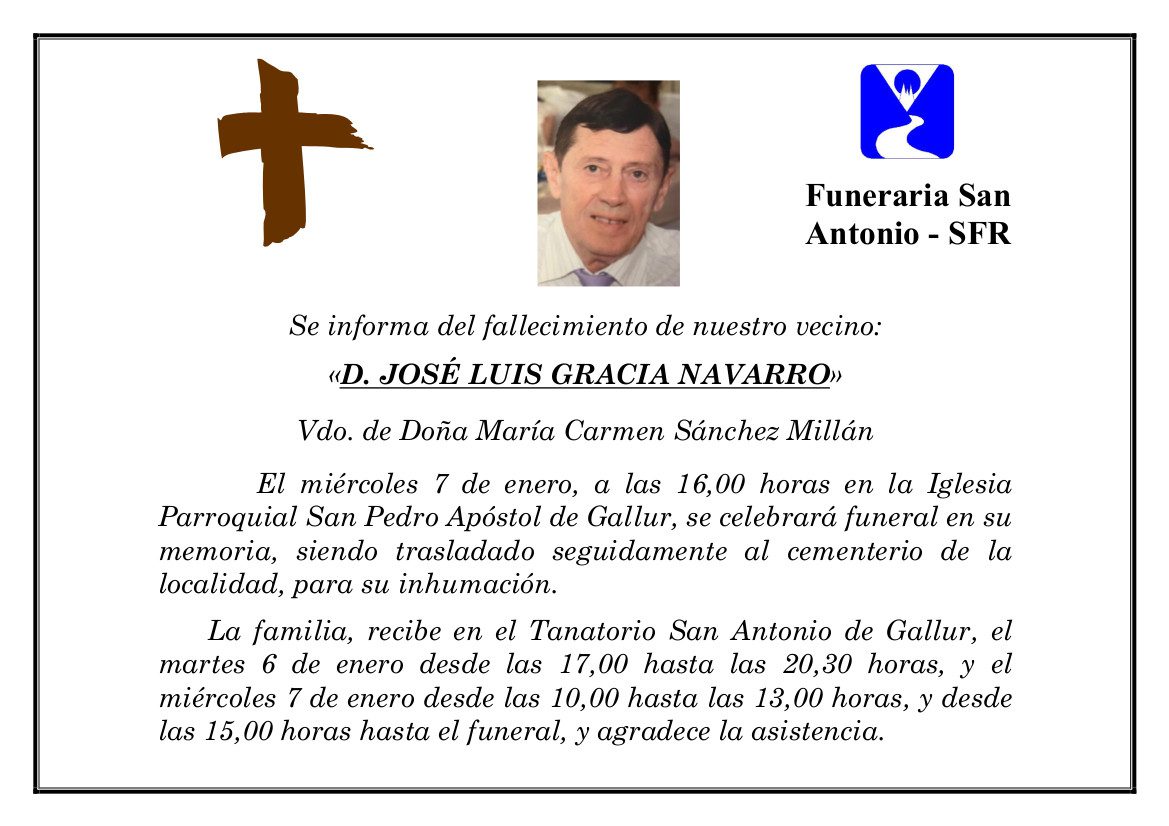 D. JOSE LUIS GRACIA NAVARRO por josemaria.sau@funerariasdetudela.es | Ene 6, 2026 | Esquelas, Tanatorio San Antonio (Gallur) 06/01/2026 Tanatorio San Antonio Gallur FUNERAL: 07/01/2026 16:00 PARROQUIA: SAN PEDRO APOSTOL de GALLUR Enviar flores Enviar condolencias